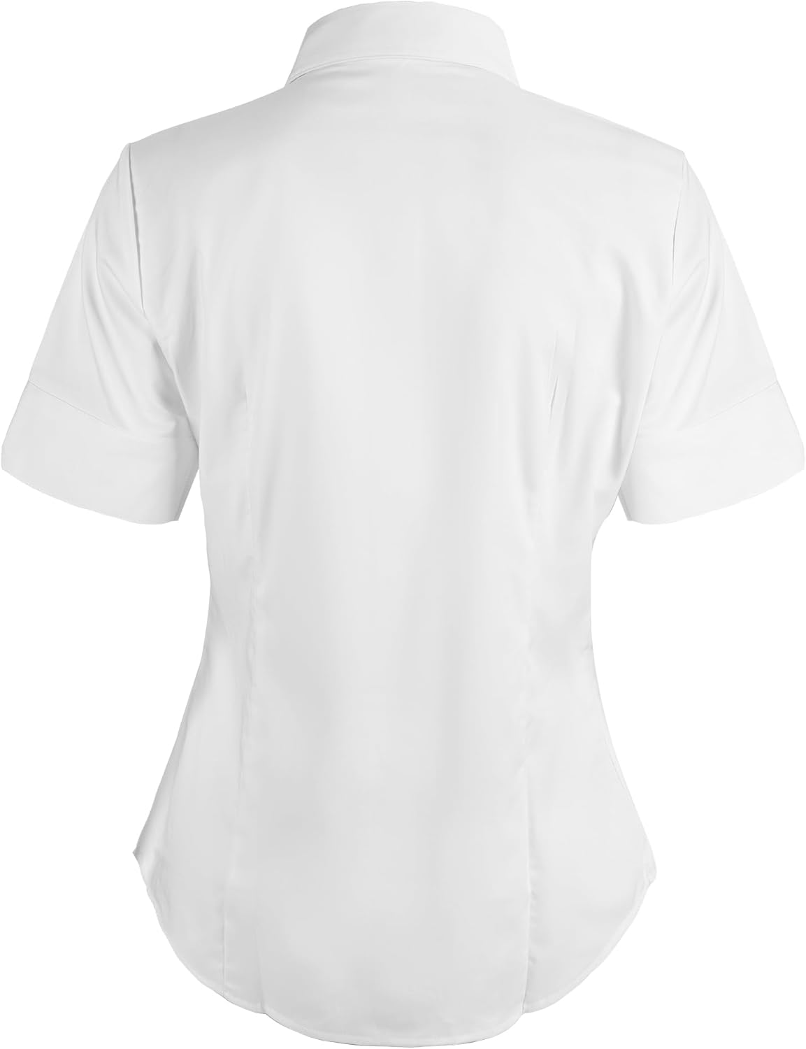 Customers find the shirt well-made, comfortable, and appreciate its stretchy material that accommodates movement at work. The white color receives positive feedback for being true white, and customers like the style, with one noting the nice sleeve detail. While some customers say it fits great, others find it runs tight, and customers disagree on whether it runs small or big.