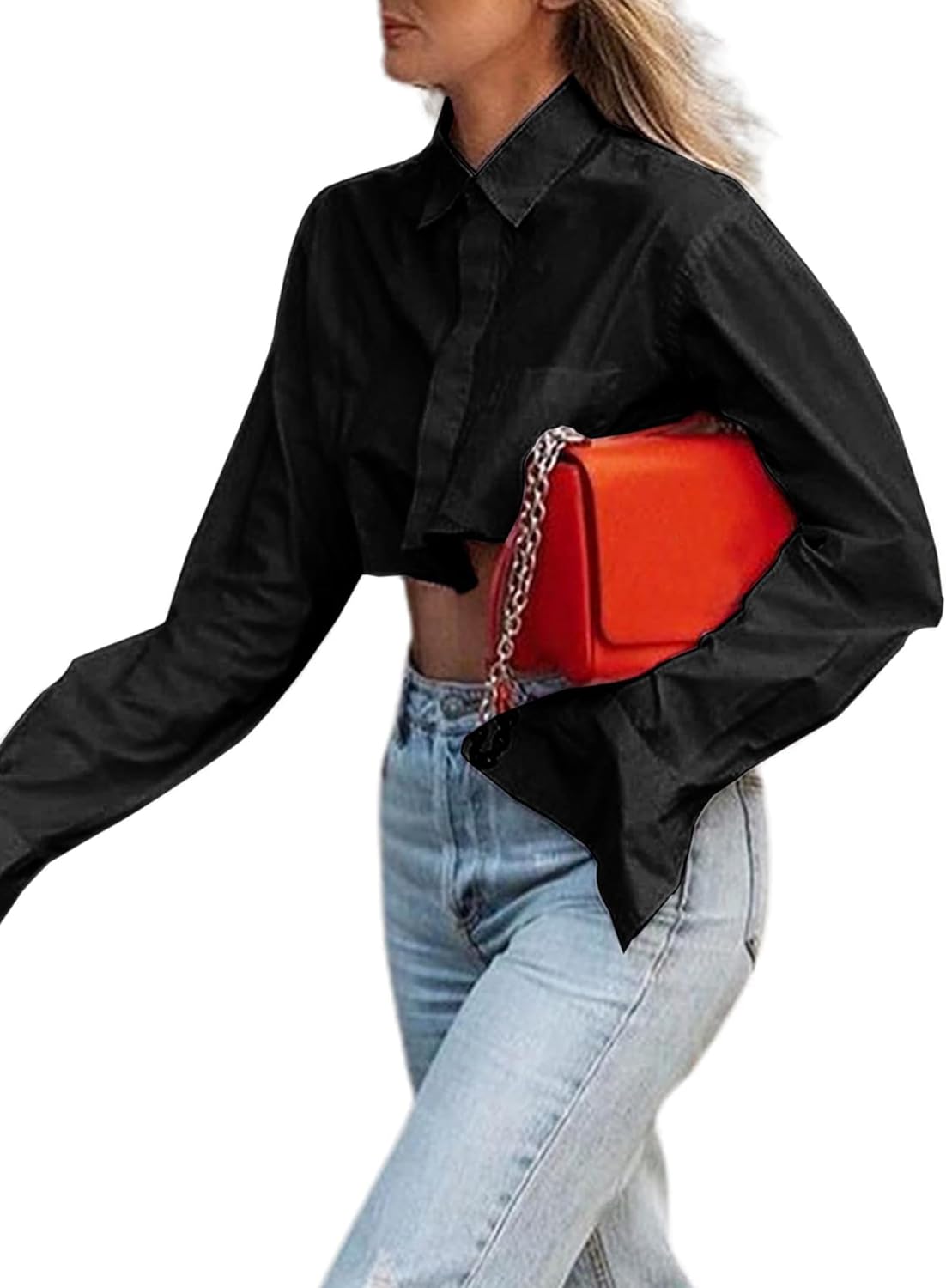 Remidoo Women’s Long Sleeve Cropped Button Up Shirt Crop Top Blouse