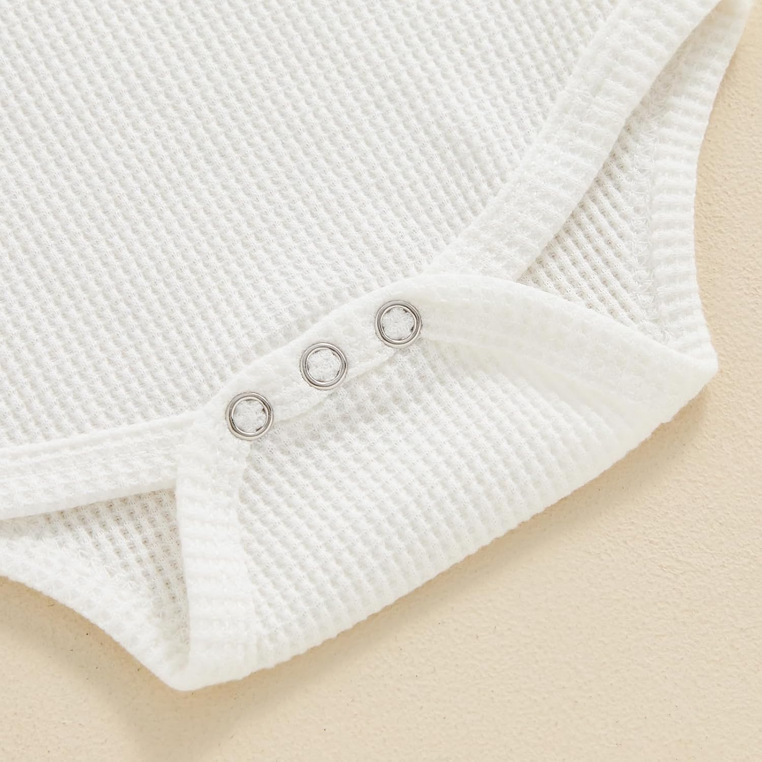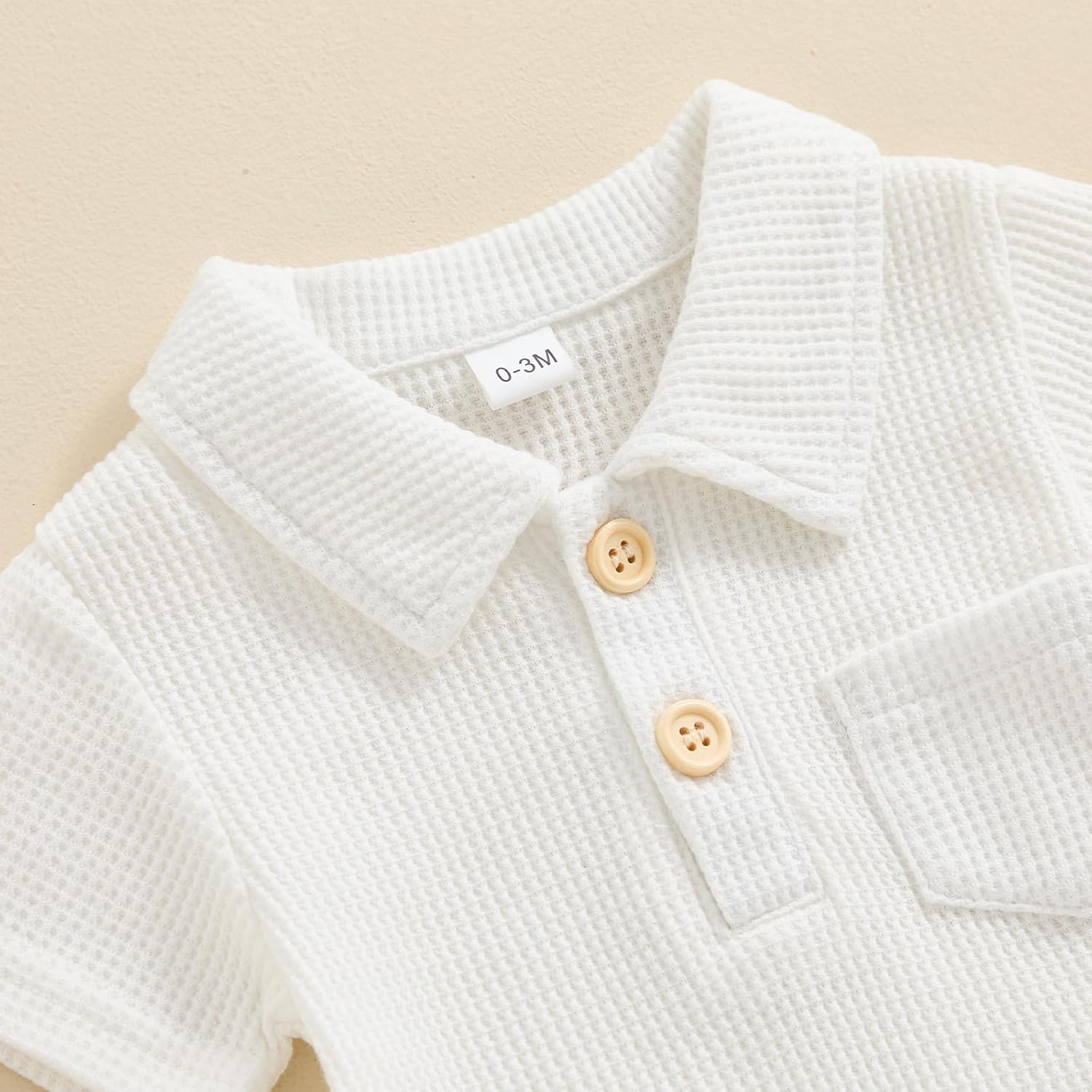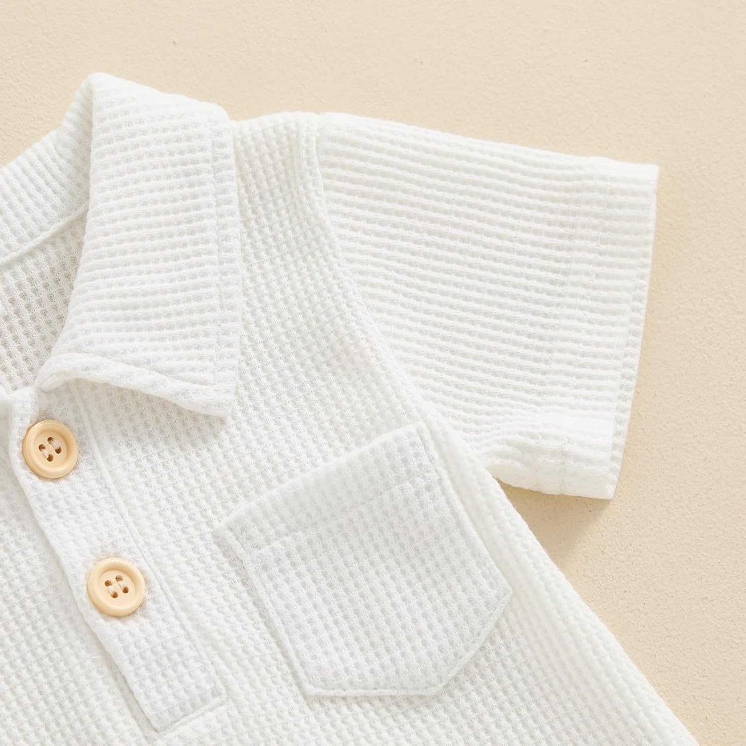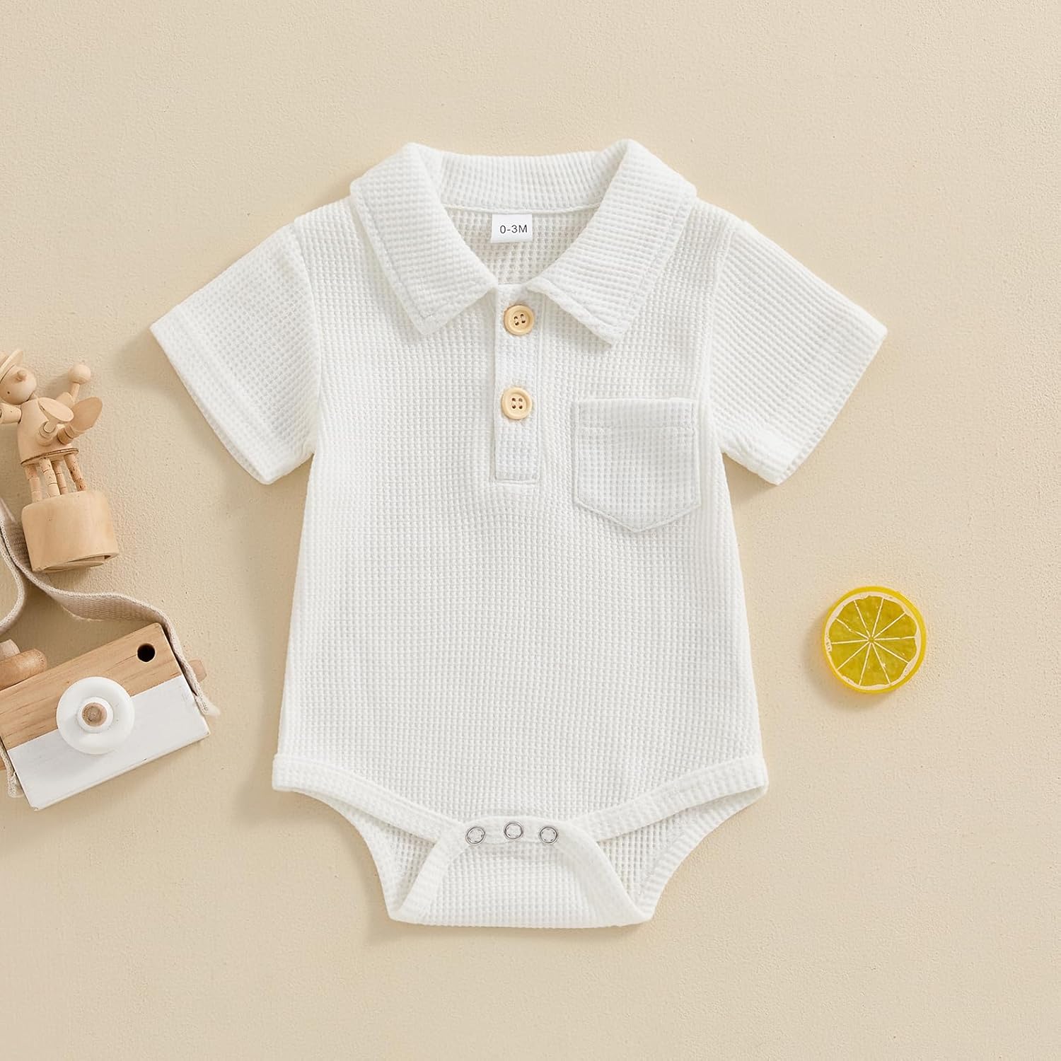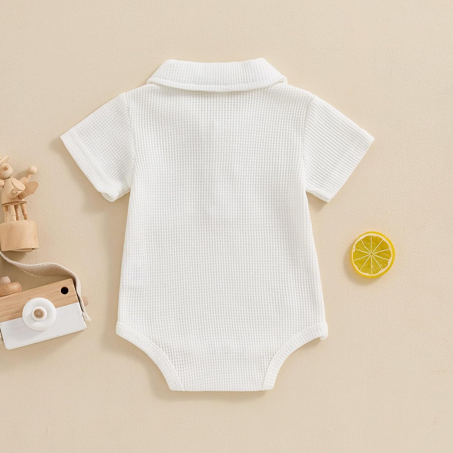 Lesimsam Newborn Baby Boy Clothes Waffle Knit Button Up Shirt Romper Solid Short Sleeve Collared Bodysuit One-Piece Outfit